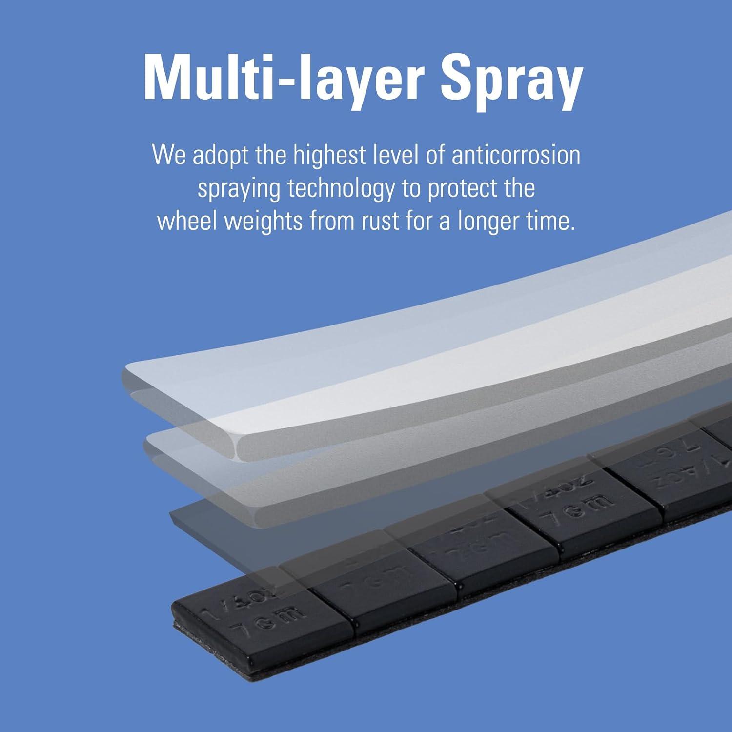 Anti-Corrosion – The surface layer of the wheel weights is first elector-galvanized, then subjected to a multi-layer and omnibus-dimensional plastic spraying process