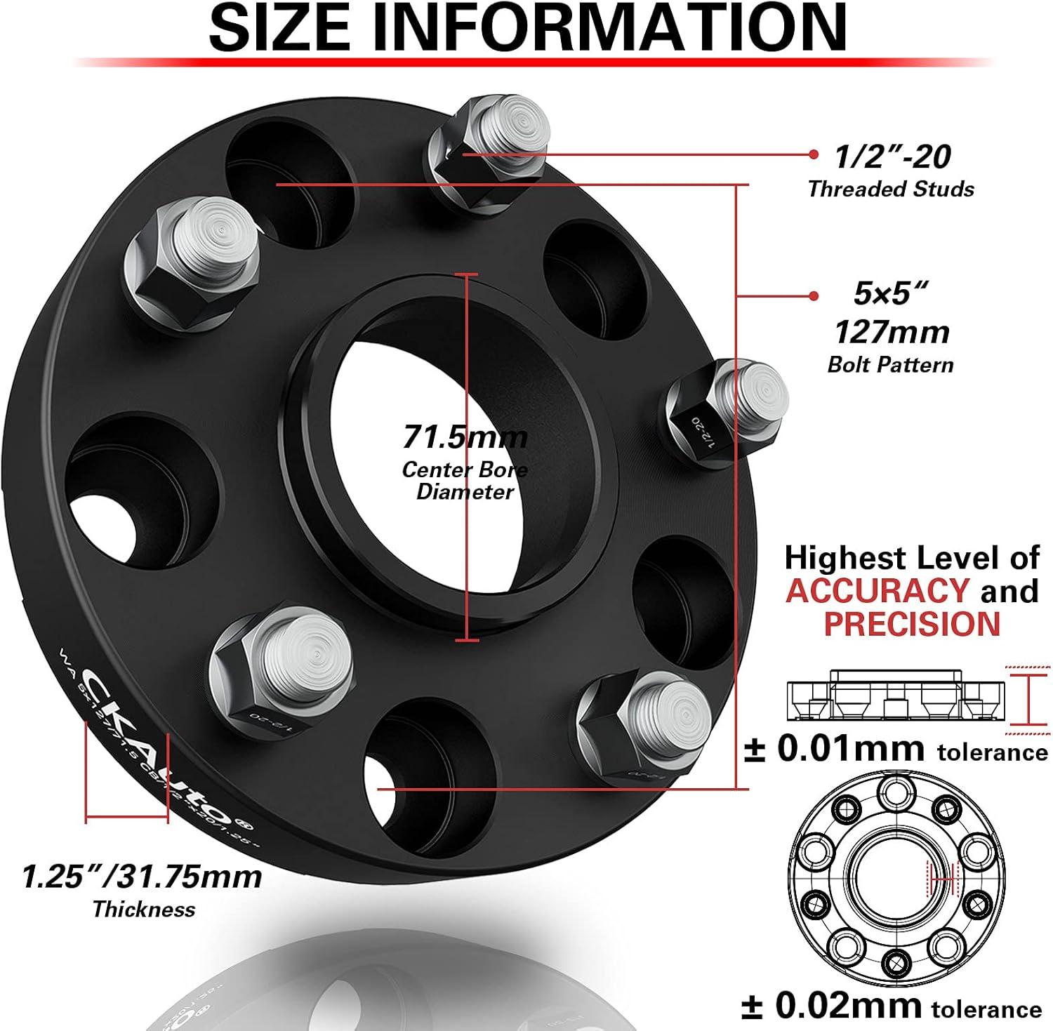 WHEEL SPACERS SPECIFICATION – Vehicle Bolt Pattern 5×5″ (5x127mm) / Thickness 1.5 inch / Hub Bore 71.5mm / Thread Pitch 1/2″ – 20 / Effective Stud length 27mm, CNC automatic processing makes the error controlled within 0.02mm.