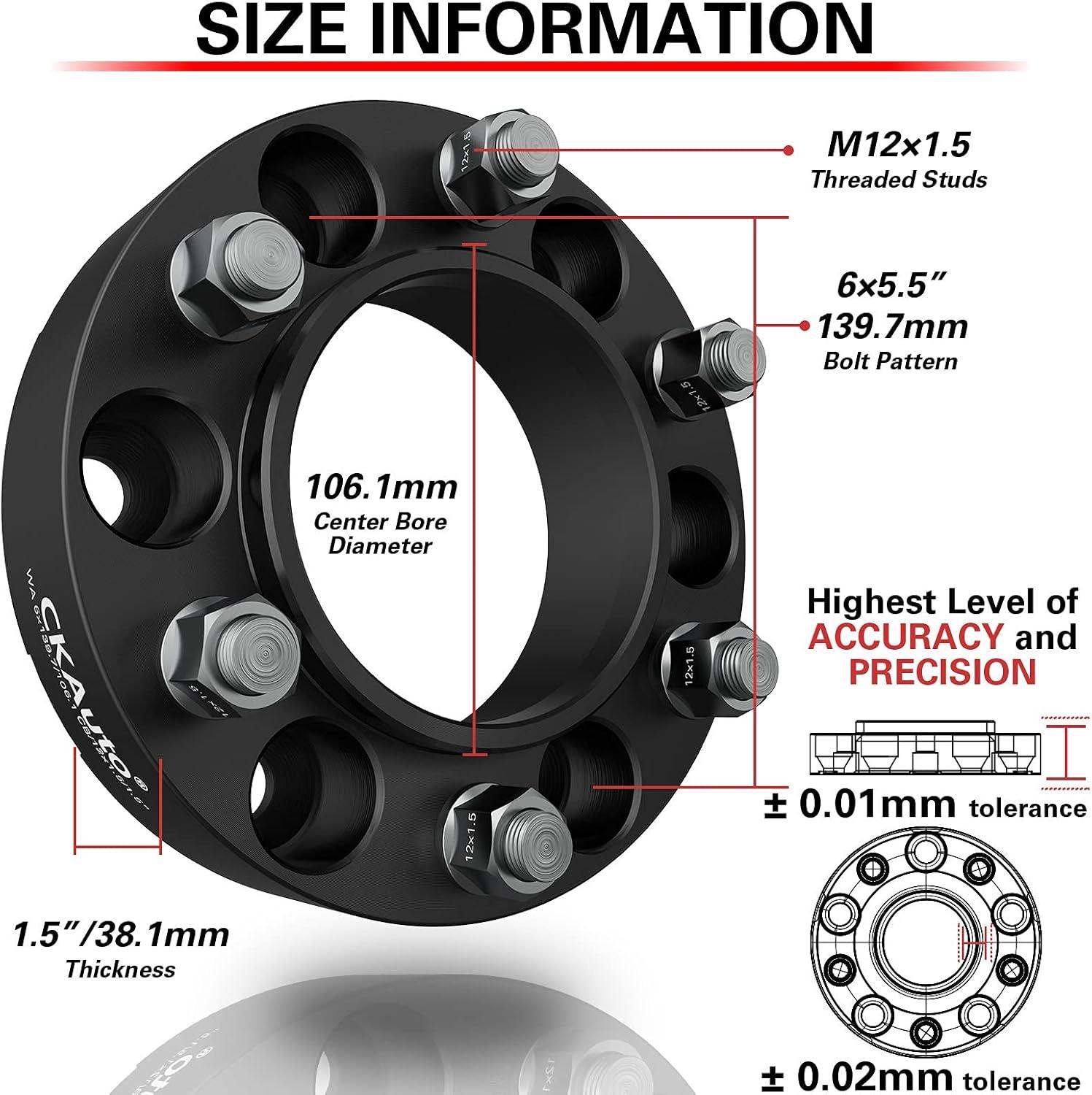 CKAuto 4 Pack 6×5.5 Hub Centric Wheel Spacers, 2.00″ 6×139.7mm Wheel Spacers, 106.1mm Center Bore with M12x1.5 Studs(1.5” Thick / 2 pack)