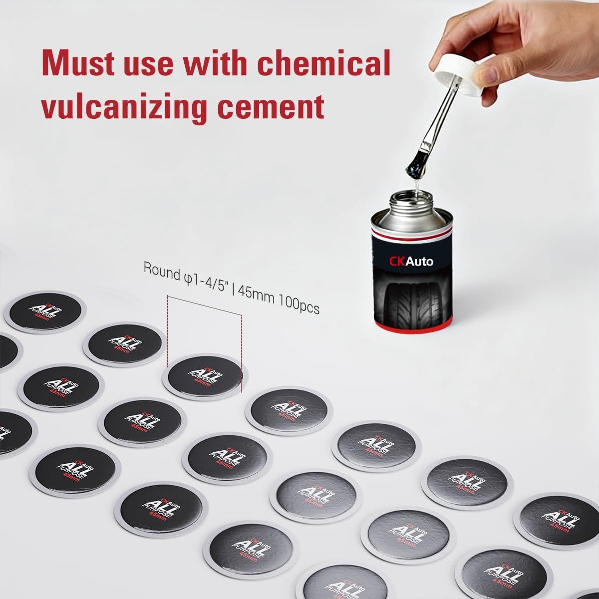 IMPORTANT NOTE: CKAuto all-purpose tire patch kit uses self-vulcanizing rubber and requires chemical vulcanizing cement to activate the bond. Cement is not included and must be purchased separately. Compatible with most major cement brands. Without cement, the patch will not adhere properly.